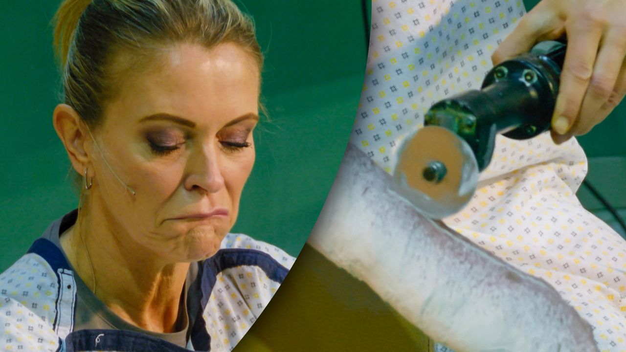 Karen snijdt gips gebroken arm open met elektrische zaag
